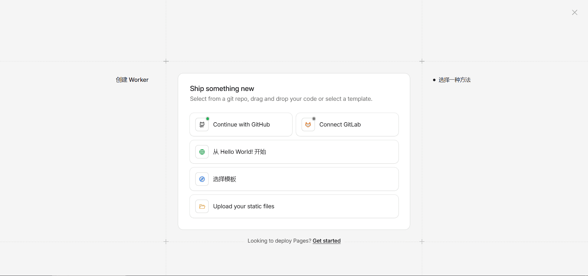 说实话这个界面挺好看的,但是我看了半天我才看到面板下面有一个小小的"Looking to deploy Pages? Get started"